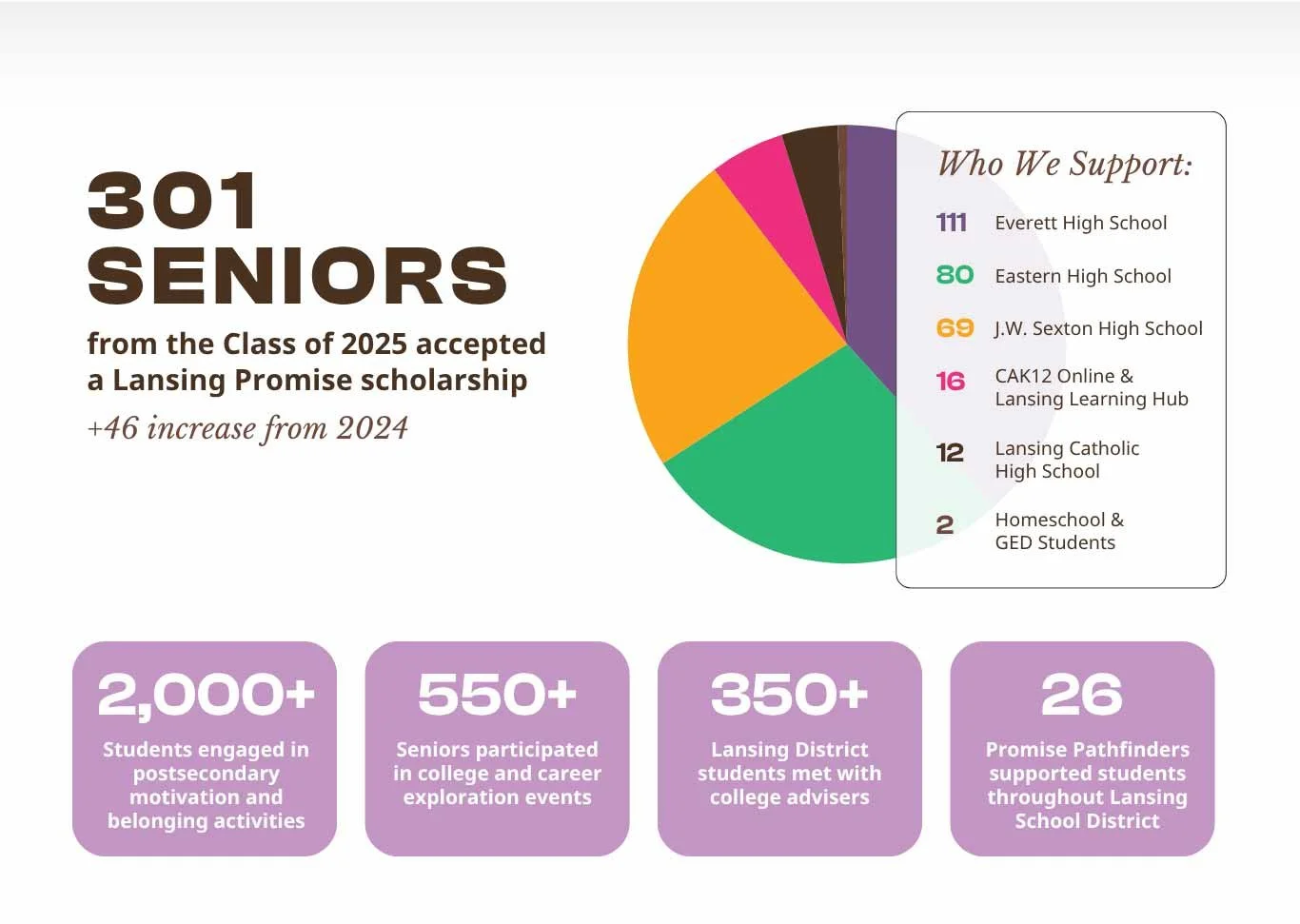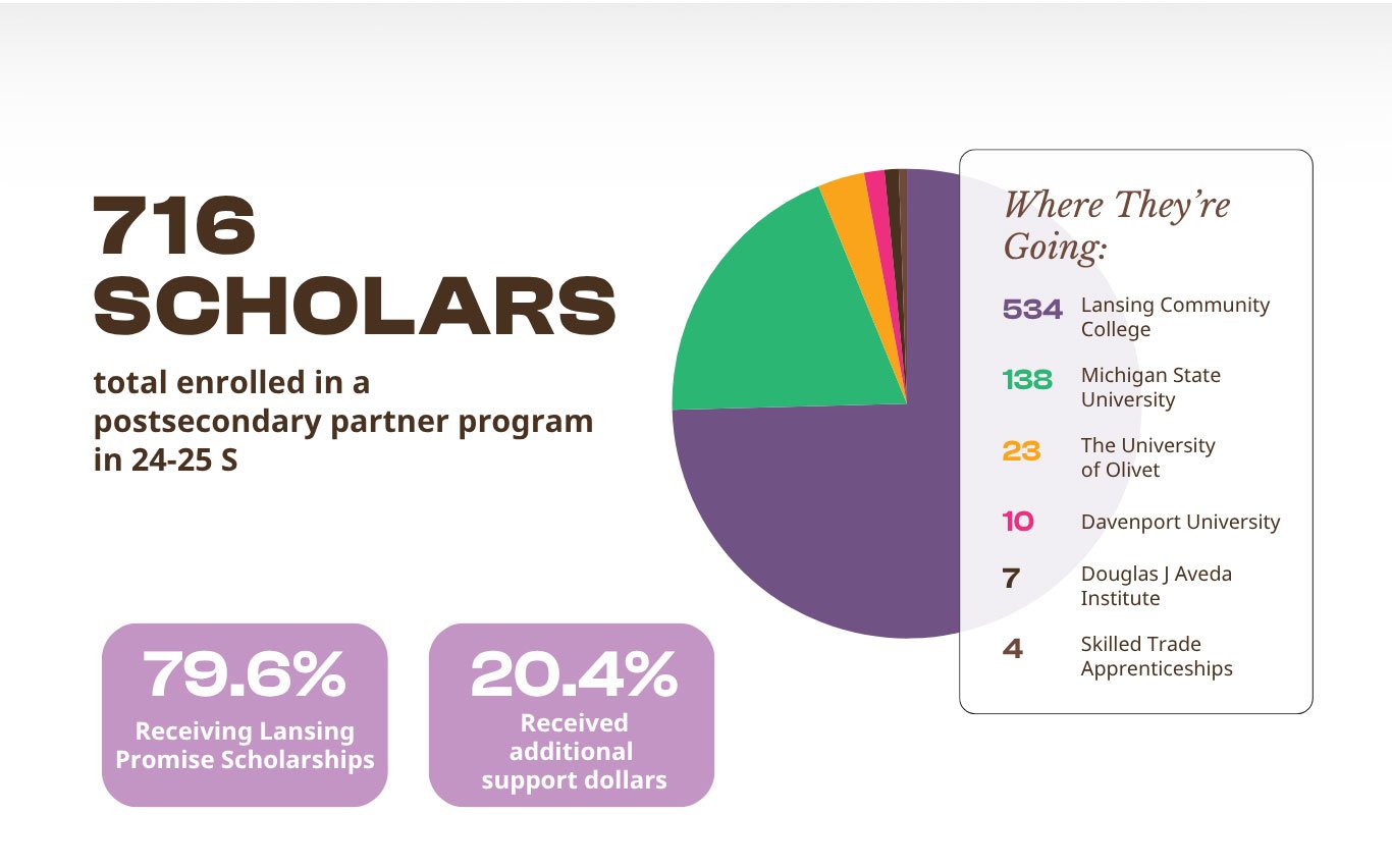 The Lansing Promise is a place-based scholarship program taking an active role in the success of our current and future scholars. We fulfill that role by raising and investing funds strategically, fostering the conditions for and the tools, resources and support necessary for success after high school and beyond on behalf of all of Lansing’s young people. We set those conditions in concert with strategic partnerships across the city, working with families, educators, students and leaders in the nonprofit, business, elected and faith communities.